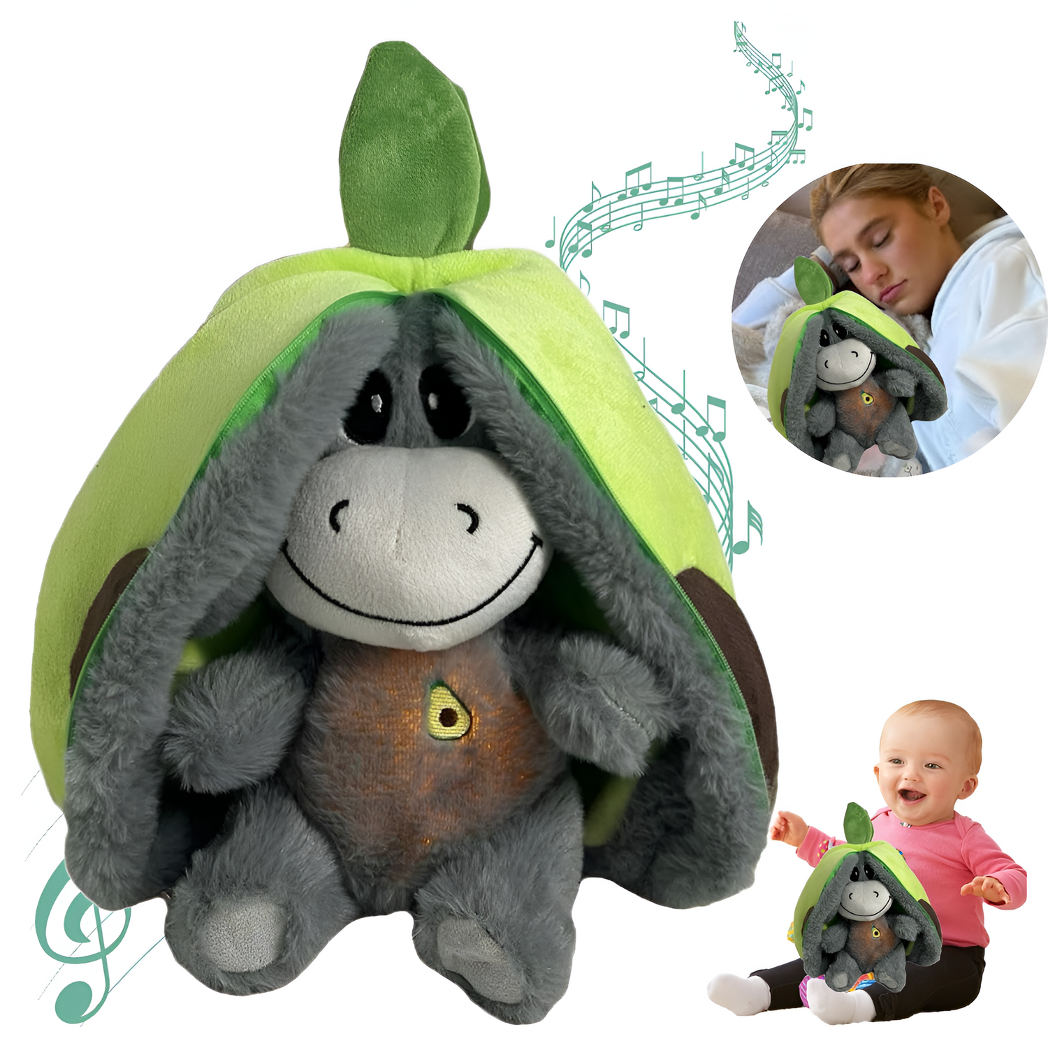 Este peluche de Burro simula la respiración y el latido de un corazón para dar una sensación completa de calma o paz. Biológicamente esta demostrado que la respiración suave y constante mejora la calidad de sueño.