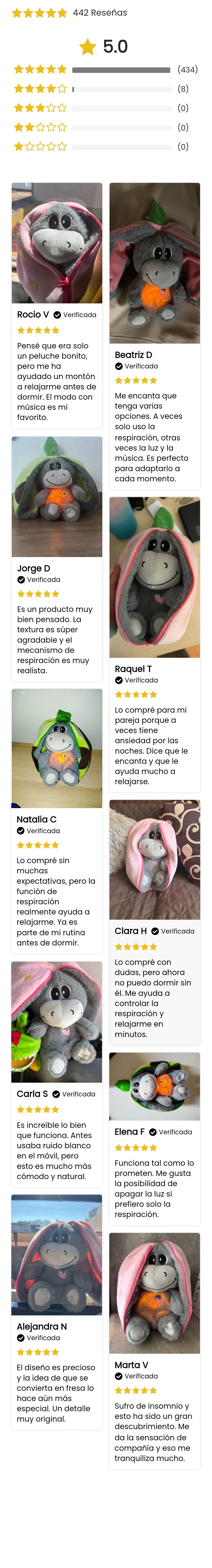Este peluche de Burro simula la respiración y el latido de un corazón para dar una sensación completa de calma o paz. Biológicamente esta demostrado que la respiración suave y constante mejora la calidad de sueño.